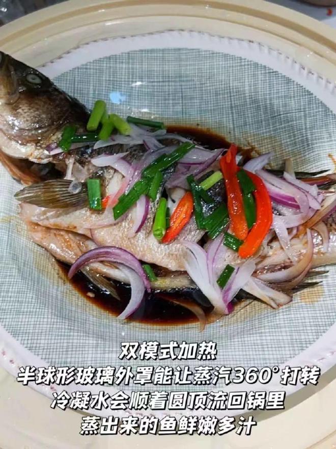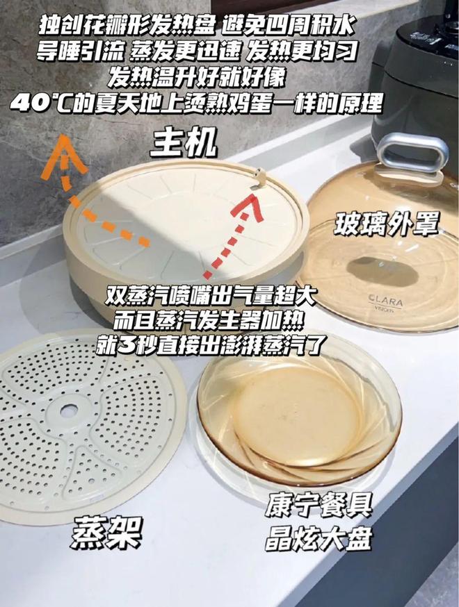它们这个锅独创了一个叫”双能效加热的设计,高温蒸汽和1900w的加热盘同时加热,再和玻璃的盖子协同,食物仓会形成一个360°微压循环,就能大大的提升速度。