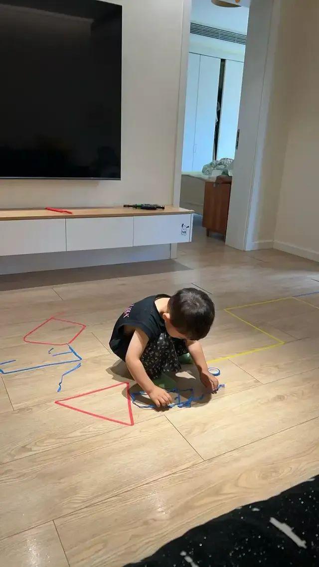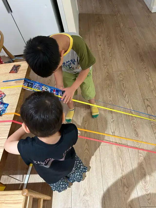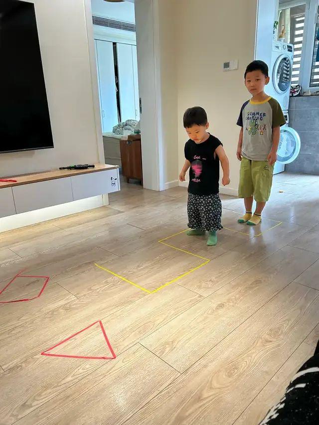 孩子在地上用美纹纸贴跳房子的格子,完成后两娃尽情跳跃,每跳一步,都是欢乐和挑战。