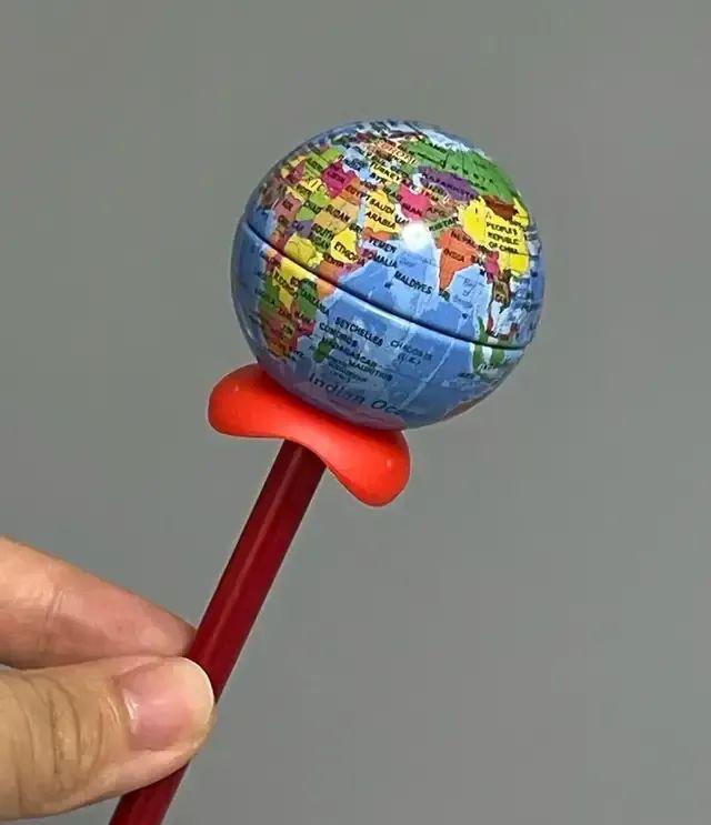 我家小宝,接着用他哥的幼儿园转笔刀,是一个地球仪转笔刀,特别Q萌,地球仪上字图蛮清晰的,平时孩子能认识上面的国家,也能当个小摆件。