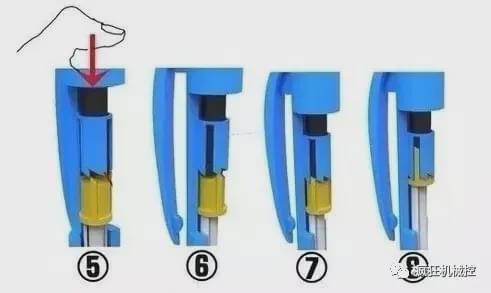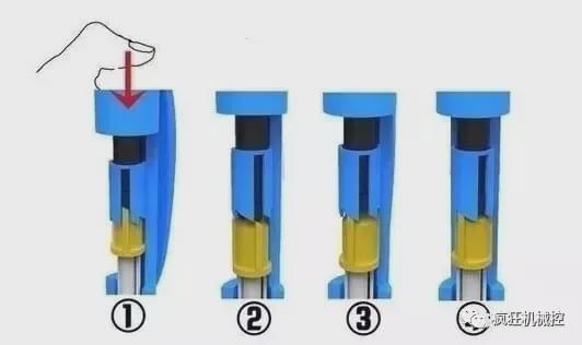 圆珠笔的伸缩工作过程,总共分八个步骤。第一步至第四步为笔芯伸出过程,第五步至第八步为笔芯缩回过程。