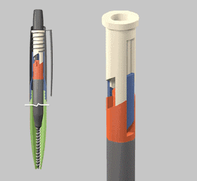 【5-8步讲解】当再次按压顶杆时,顶杆头部的尖状特征与转盘的斜面分离,转盘受径向力旋转,转盘与滑槽的啮合处重合,笔芯缩回。