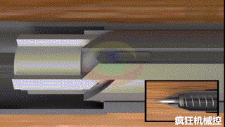 【1-4步讲解】我们用手指按压圆珠笔顶部时,是给顶杆施加一个向下的压力,顶杆沿滑槽运动压迫转盘向下运动,当转盘与滑槽的啮合处脱离时,顶杆头部的尖状特征与转盘的斜面接触处产生径向力强迫转盘旋转,笔芯伸出。