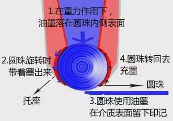 圆珠笔的冒油原因:圆珠笔在书写时,一部分油墨从球珠转印到书写物上,球珠转印后变白,另一部分油墨会随球珠转动带回球座内。好的笔头,随球珠转动将油墨带回球座较彻底,油墨沾在球座头外面较少,比较干净。较差的笔头,油墨会大部分沾在球座头外面,无法带回球座内,即我们所称的冒油现象,书写时,很容易污染书写物。